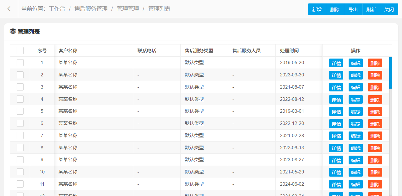 管理功能主要字段信息包含:管理编码、客户名称、联系电话、售后服务类型、售后服务人员、处理时间、备注等。使用表格形式展示数据信息,方便用户查看和编辑。