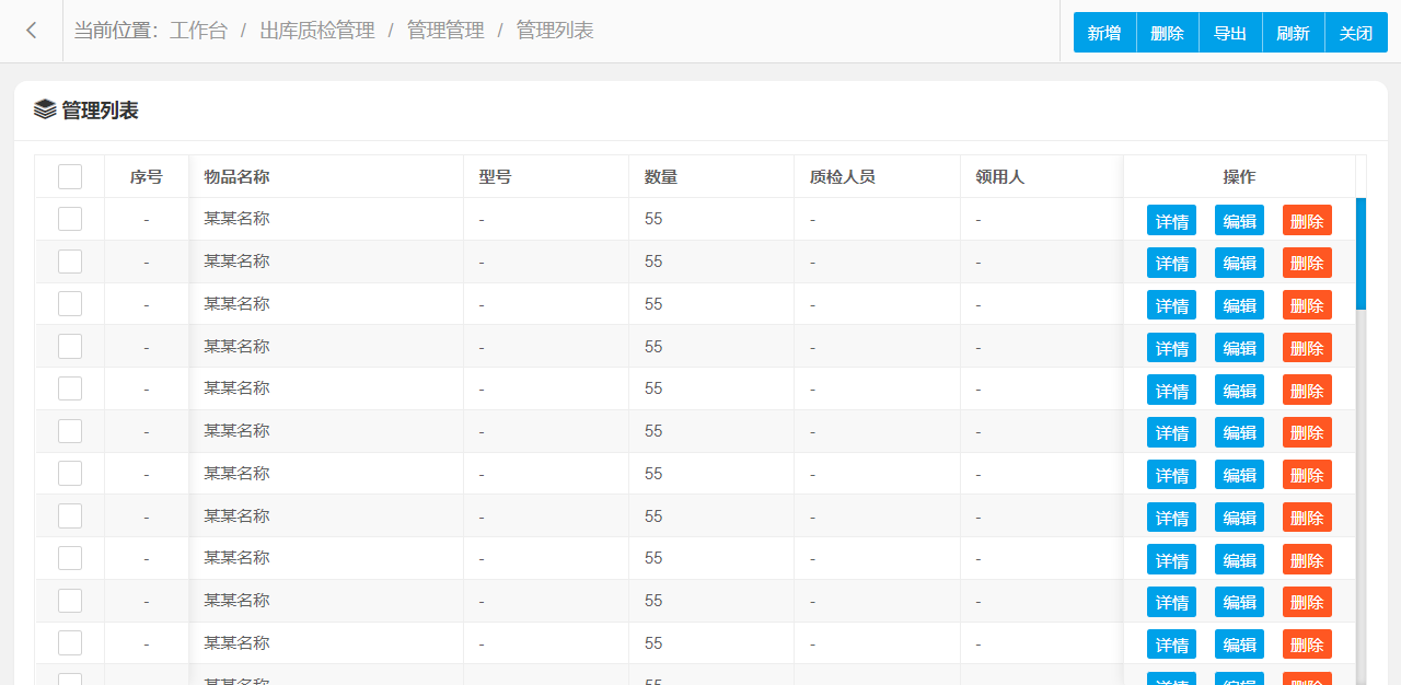 管理功能主要字段信息包含:管理编码、物品名称、型号、数量、质检人员、领用人、出库时间、备注等。使用表格形式展示数据信息,方便用户查看和编辑。