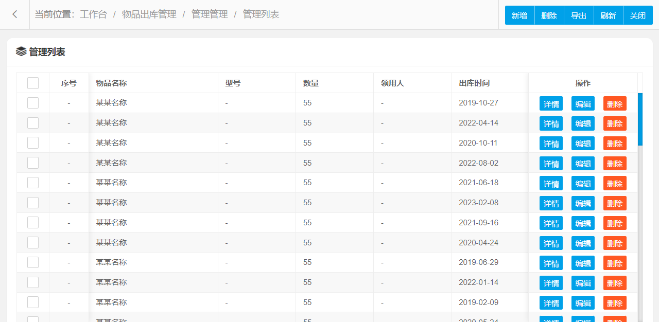 管理功能主要字段信息包含:管理编码、物品名称、型号、数量、领用人、出库时间、备注等。使用表格形式展示数据信息,方便用户查看和编辑。