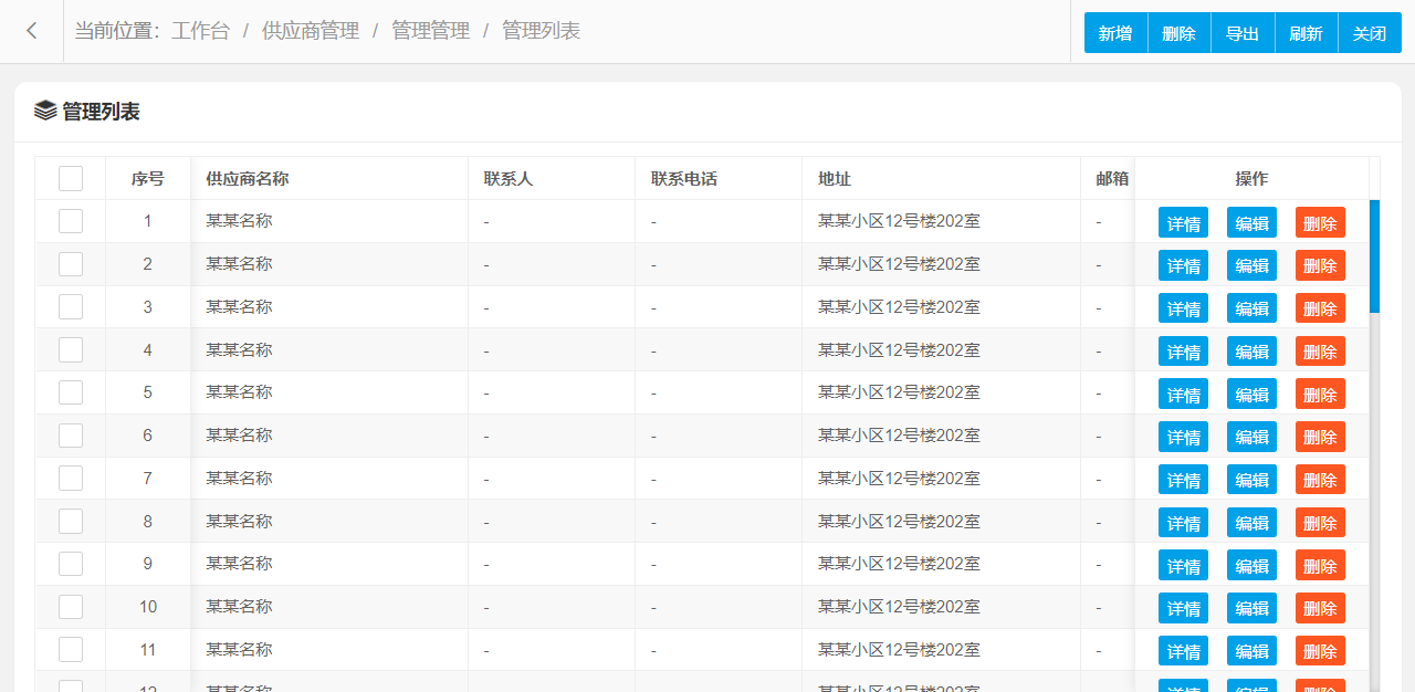 管理功能主要字段信息包含:管理编码、供应商名称、联系人、联系电话、地址、邮箱、备注等。使用表格形式展示数据信息,方便用户查看和编辑。