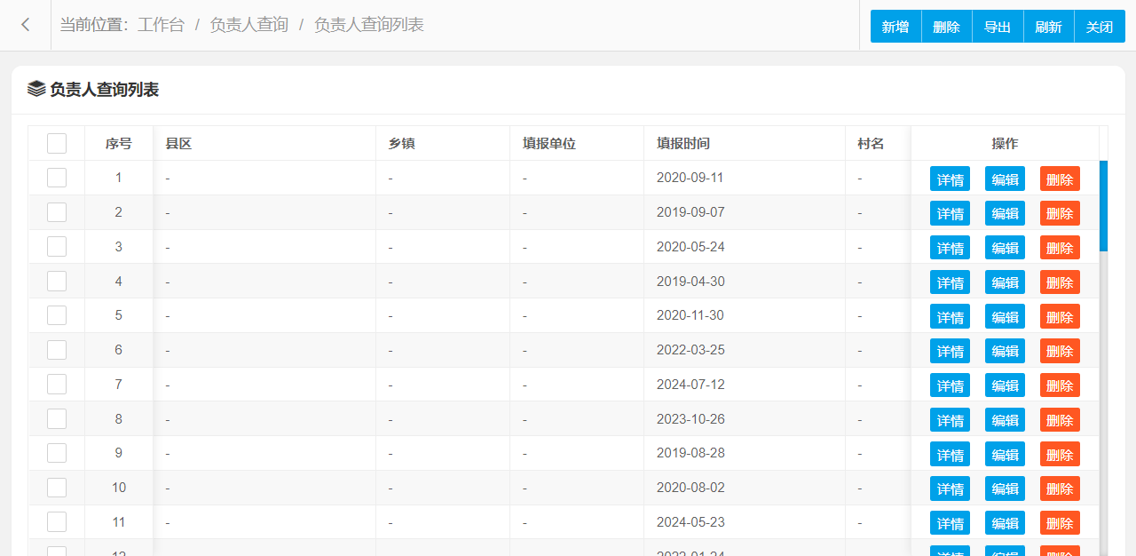 负责人查询管理设置新增、编辑、删除、条件搜索、查看详情等操作,可按照页面提示进行操作执行,界面结构设计简单,操作流程简洁明了,可提升用户操作体验。