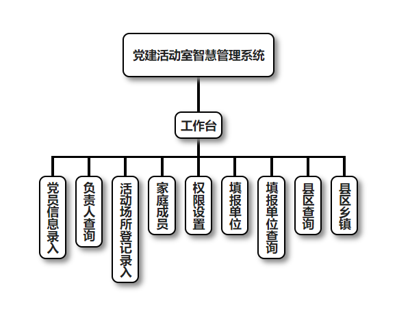 工作台包含:党员信息录入、负责人查询、活动场所登记录入、家庭成员、权限设置、填报单位、填报单位查询、县区查询、县区乡镇,根据不同角色权限菜单展示会有所区别。