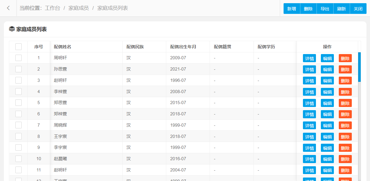 家庭成员管理功能主要字段信息包含:编码、配偶姓名、配偶民族、配偶出生年月、配偶籍贯、配偶学历、配偶参加工作时间、配偶政治面貌、配偶单位职务及职业、姓名、出生年月、单位职务或职业、政治面貌、关系、编号等。使用表格形式展示数据信息,方便用户查看和编辑。