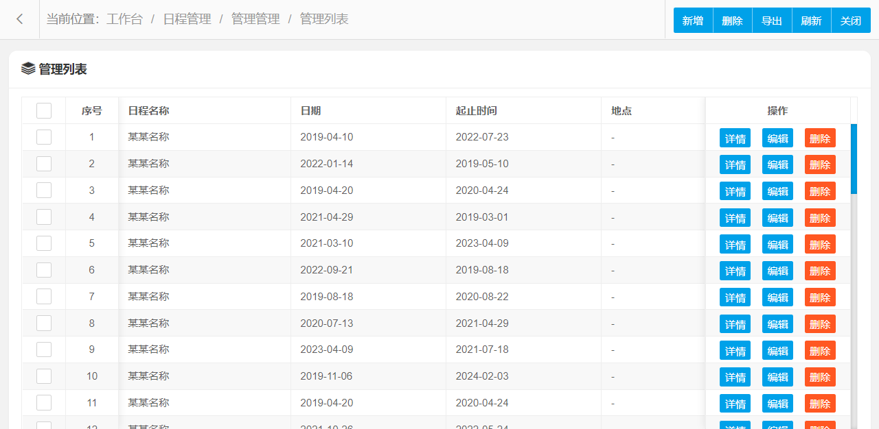 管理功能主要字段信息包含:管理编码、日程名称、日期、起止时间、地点、日程描述等。使用表格形式展示数据信息,方便用户查看和编辑。