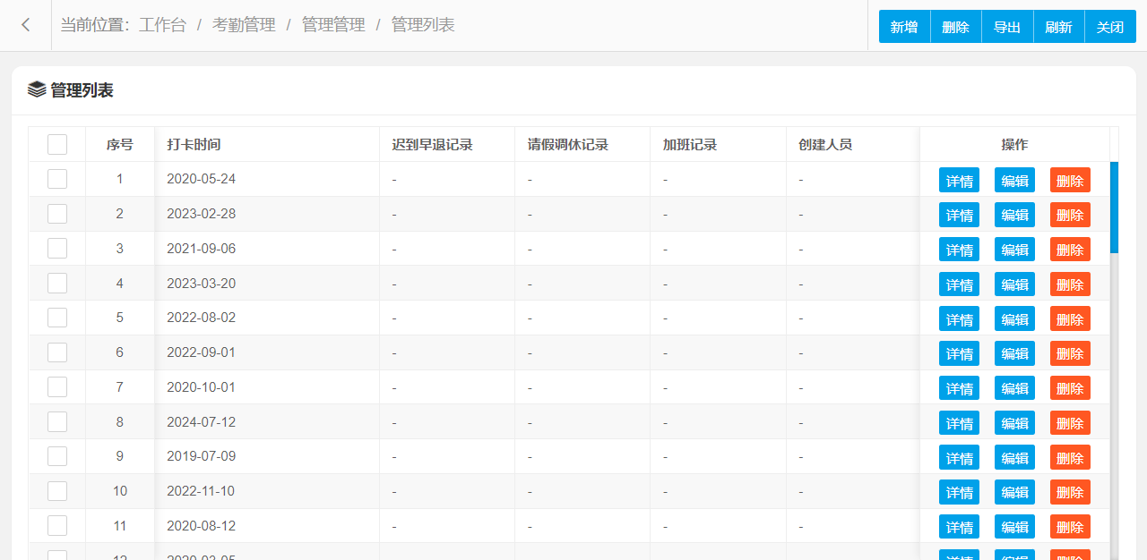 管理功能主要字段信息包含:管理编码、打卡时间、迟到早退记录、请假调休记录、加班记录等。使用表格形式展示数据信息,方便用户查看和编辑。