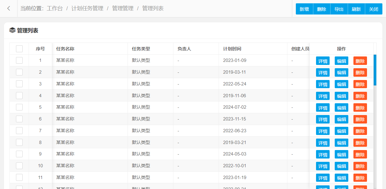 管理功能主要字段信息包含:管理编码、任务名称、任务类型、任务描述、负责人、计划时间等。使用表格形式展示数据信息,方便用户查看和编辑。