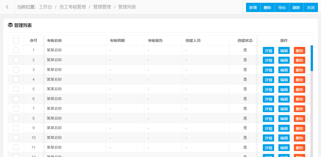 管理功能主要字段信息包含:管理编码、考核名称、考核周期、考核内容、考核报告等。使用表格形式展示数据信息,方便用户查看和编辑。