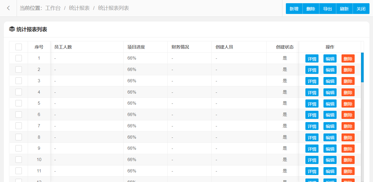统计报表管理功能主要字段信息包含:编码、员工人数、项目进度、财务情况等。使用表格形式展示数据信息,方便用户查看和编辑。