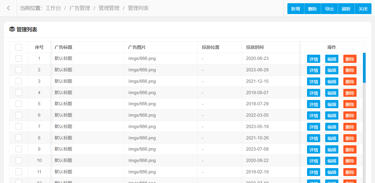 管理功能主要字段信息包含:管理编码、广告标题、广告图片、投放位置、投放时间、投放方式等。使用表格形式展示数据信息,方便用户查看和编辑。