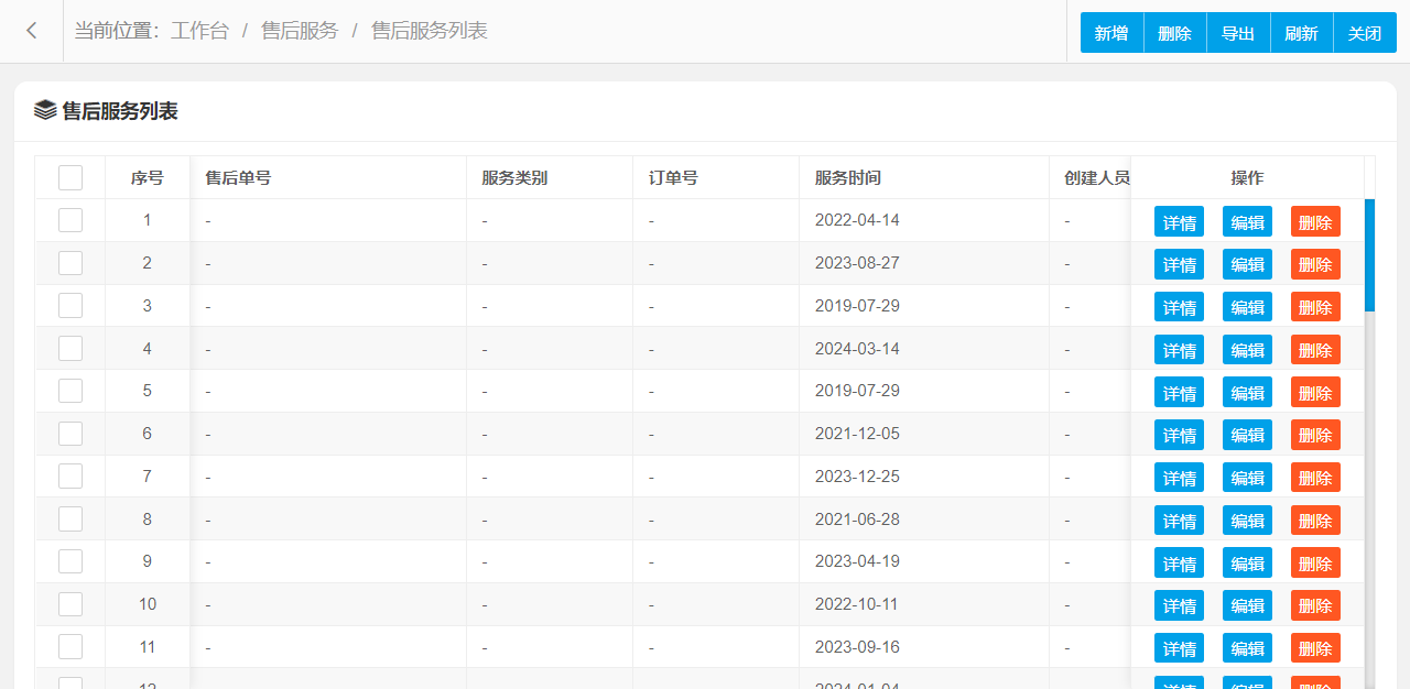 售后服务管理功能主要字段信息包含:编码、售后单号、服务类别、订单号、服务时间、服务内容等。使用表格形式展示数据信息,方便用户查看和编辑。