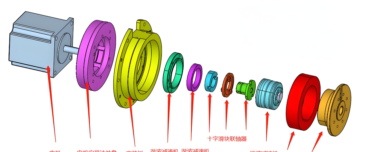 高减速比与轻量化:谐波减速机(单级减速比 50)。