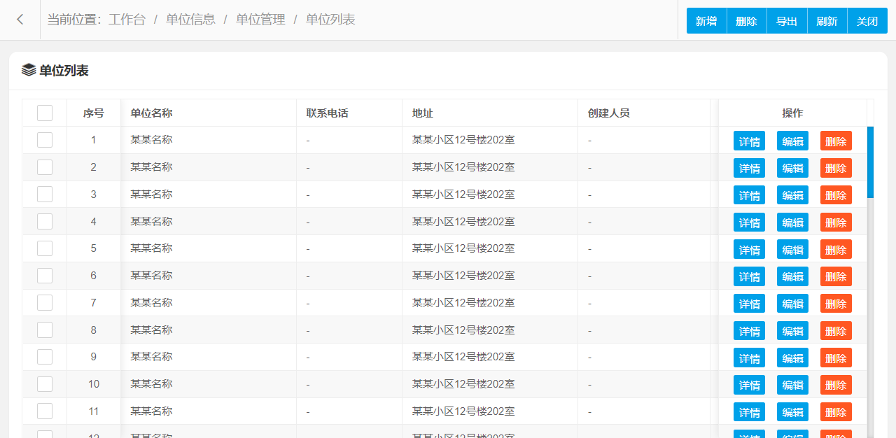 单位管理设置新增、编辑、删除、条件搜索、查看详情等操作,可按照页面提示进行操作执行,界面结构设计简单,操作流程简洁明了,可提升用户操作体验。