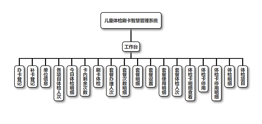 工作台包含:办卡登记、补卡登记、单位信息、各项目体检人次、今日体检明细、卡内剩余次数、刷卡体检、套餐办理人次、套餐次数明细、套餐明细、套餐设置、套餐使用明细、套餐体检人次、体检卡明细查看、体检卡停用、体检卡停用明细、体检明细、体检项目,根据不同角色权限菜单展示会有所区别。