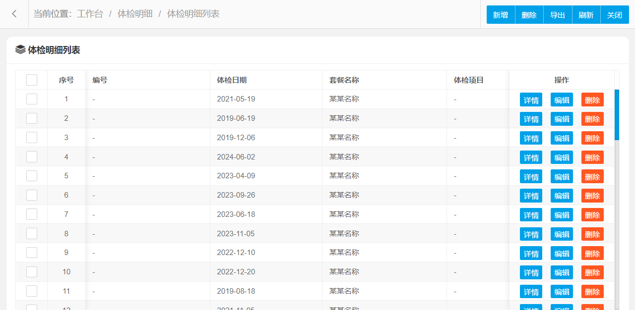 体检明细管理设置新增、编辑、删除、条件搜索、查看详情等操作,可按照页面提示进行操作执行,界面结构设计简单,操作流程简洁明了,可提升用户操作体验。