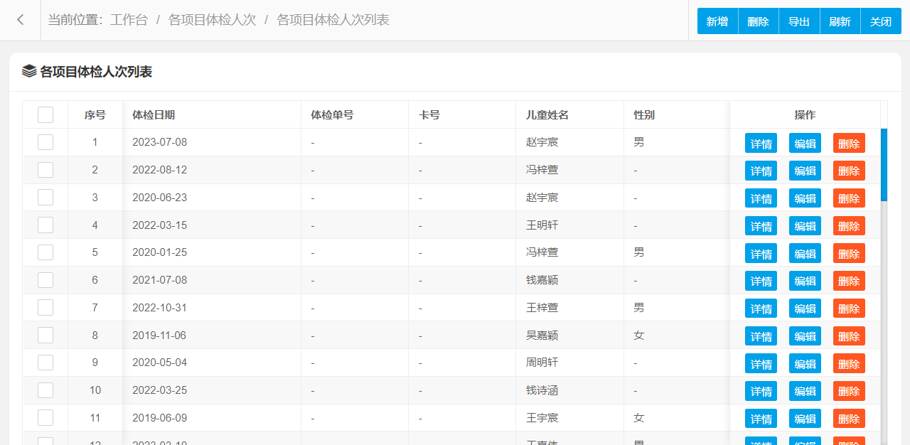 各项目体检人次管理功能主要字段信息包含:编码、体检日期、体检单号、卡号、儿童姓名、性别、出生日期、家长电话、套餐名称、体检项目、经办人、起始日期、截止日期等。使用表格形式展示数据信息,方便用户查看和编辑。