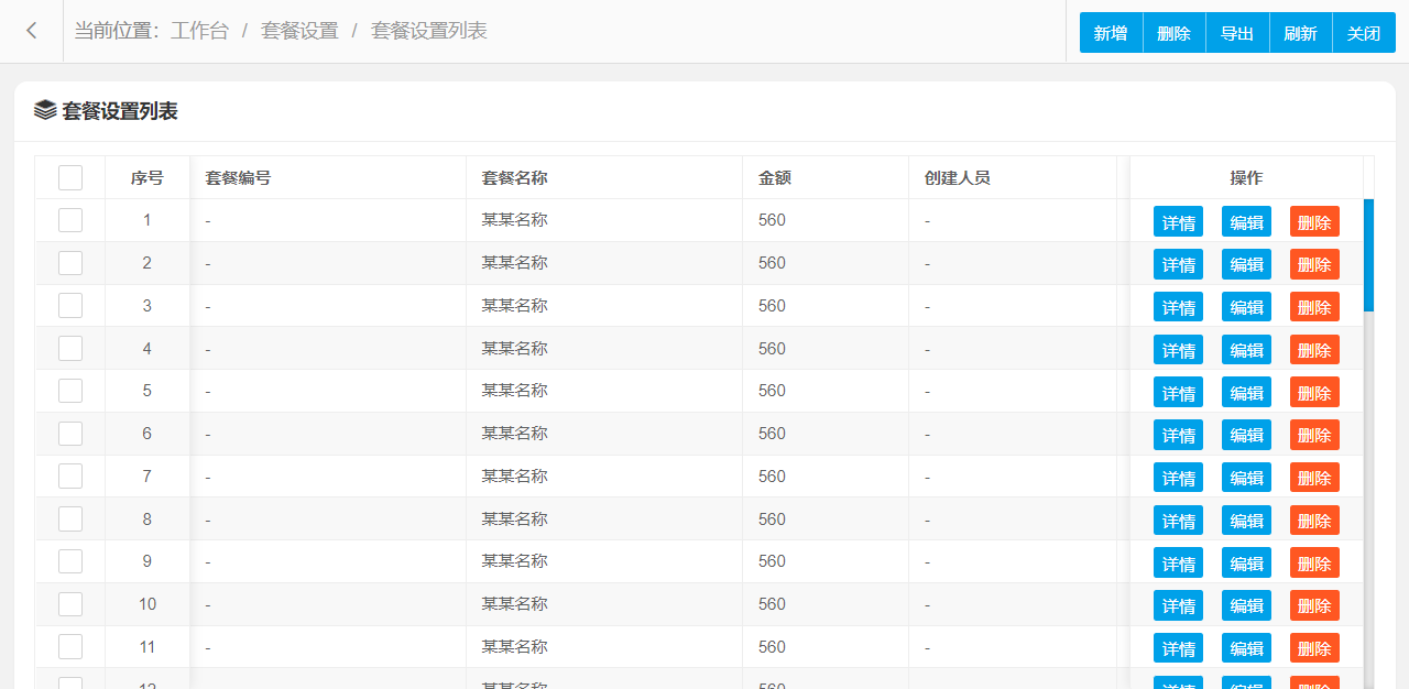 套餐设置管理功能主要字段信息包含:编码、套餐编号、套餐名称、金额等。使用表格形式展示数据信息,方便用户查看和编辑。
