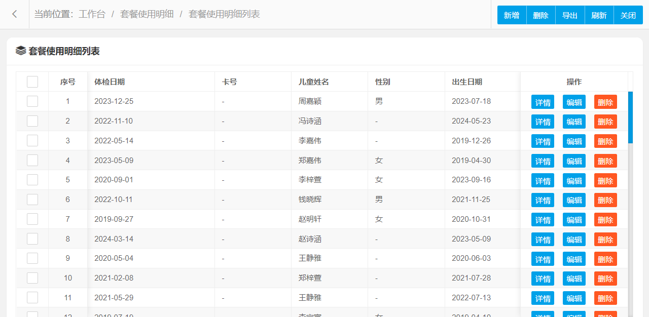 套餐使用明细管理功能主要字段信息包含:编码、体检日期、卡号、儿童姓名、性别、出生日期、家长电话、套餐名称、体检项目、经办人等。使用表格形式展示数据信息,方便用户查看和编辑。