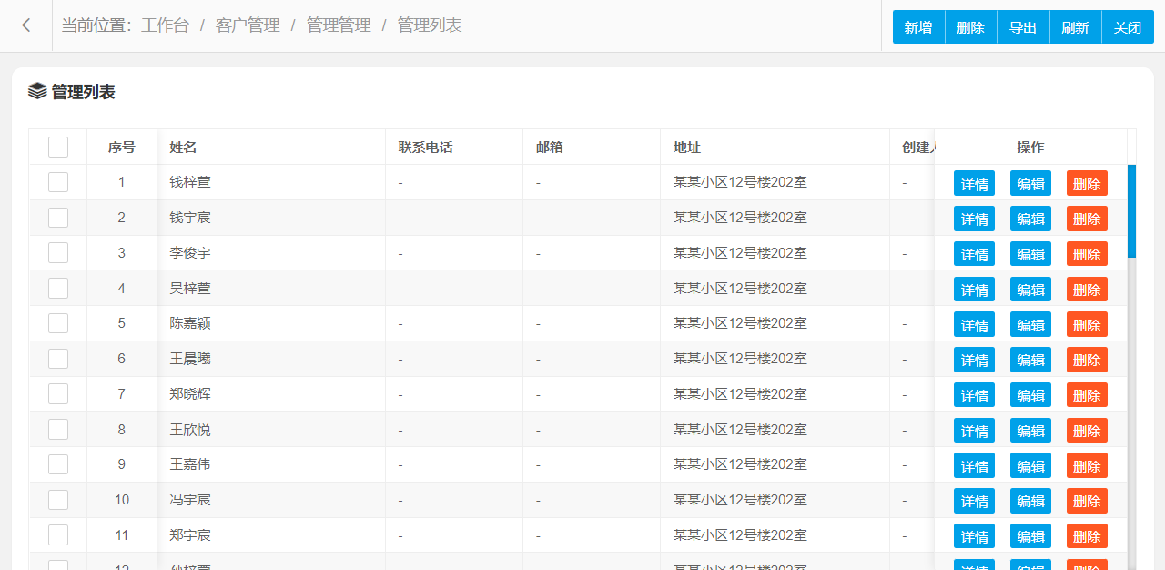 管理功能主要字段信息包含:管理编码、姓名、联系电话、邮箱、地址、备注等。使用表格形式展示数据信息,方便用户查看和编辑。