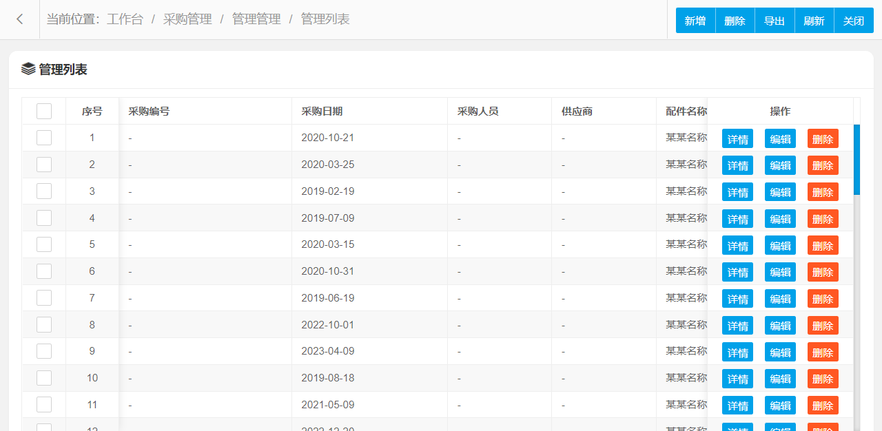 管理功能主要字段信息包含:管理编码、采购编号、采购日期、采购人员、供应商、配件名称、数量、单价、总价等。使用表格形式展示数据信息,方便用户查看和编辑。