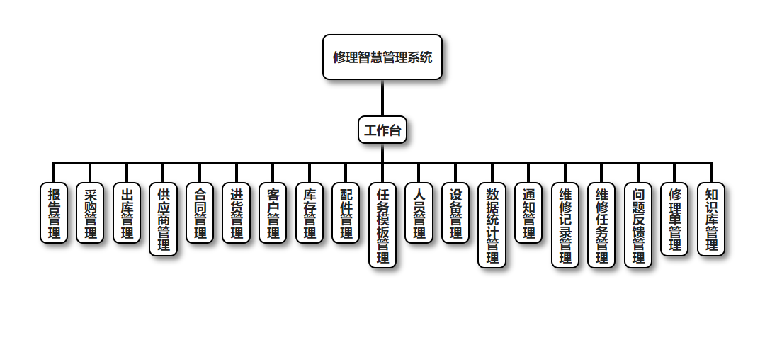 工作台包含:报告管理、采购管理、出库管理、供应商管理、合同管理、进货管理、客户管理、库存管理、配件管理、任务模板管理、人员管理、设备管理、数据统计管理、通知管理、维修记录管理、维修任务管理、问题反馈管理、修理单管理、知识库管理,根据不同角色权限菜单展示会有所区别。
