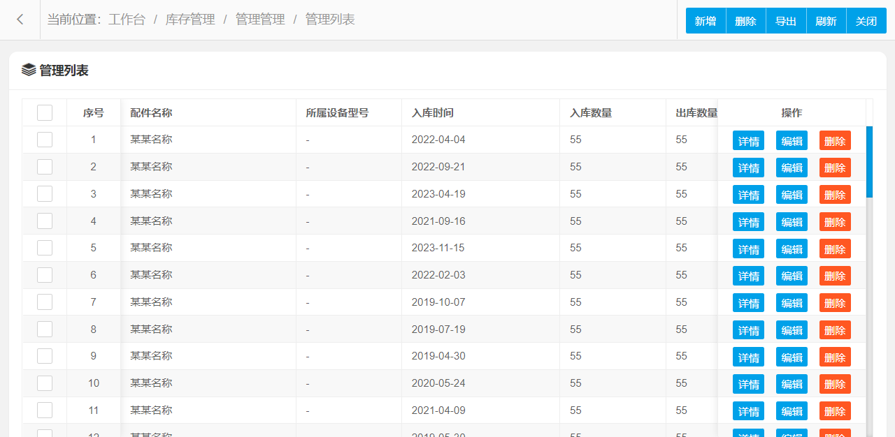 管理功能主要字段信息包含:管理编码、配件编号、配件名称、所属设备型号、入库日期、数量、单价等。使用表格形式展示数据信息,方便用户查看和编辑。