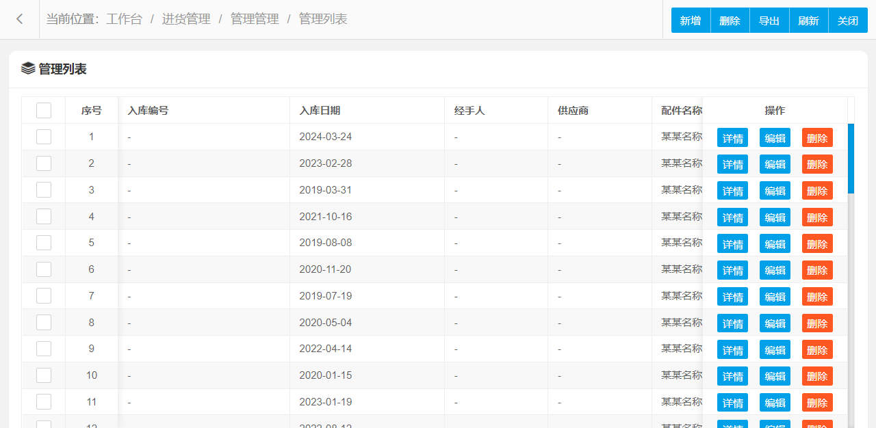 管理功能主要字段信息包含:管理编码、入库编号、入库日期、经手人、供应商、配件名称、数量、单价、总价等。使用表格形式展示数据信息,方便用户查看和编辑。
