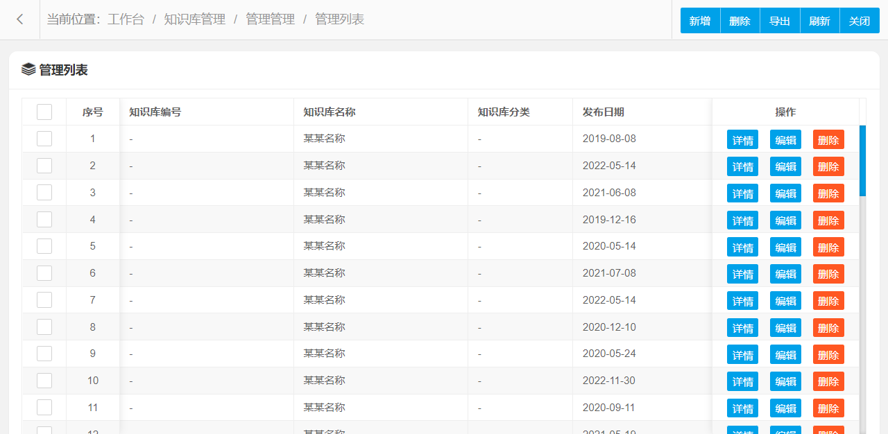 管理功能主要字段信息包含:管理编码、知识库编号、知识库名称、知识库分类、知识库内容、发布日期等。使用表格形式展示数据信息,方便用户查看和编辑。