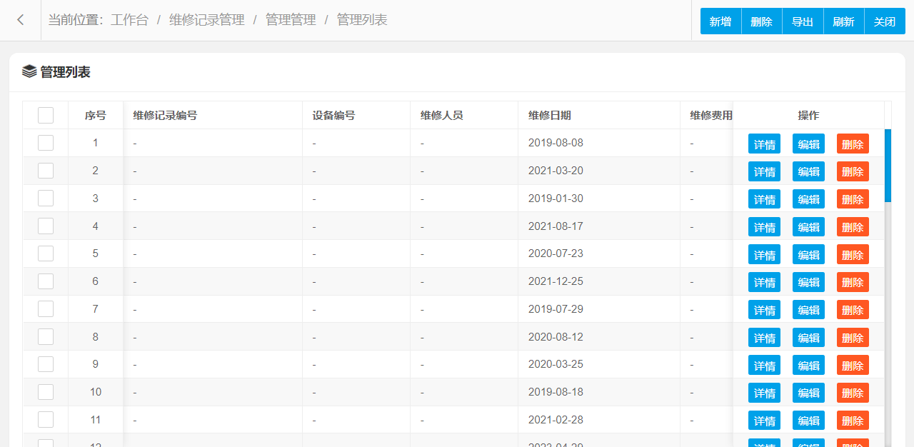 管理功能主要字段信息包含:管理编码、维修记录编号、设备编号、故障描述、维修人员、维修日期、维修费用等。使用表格形式展示数据信息,方便用户查看和编辑。