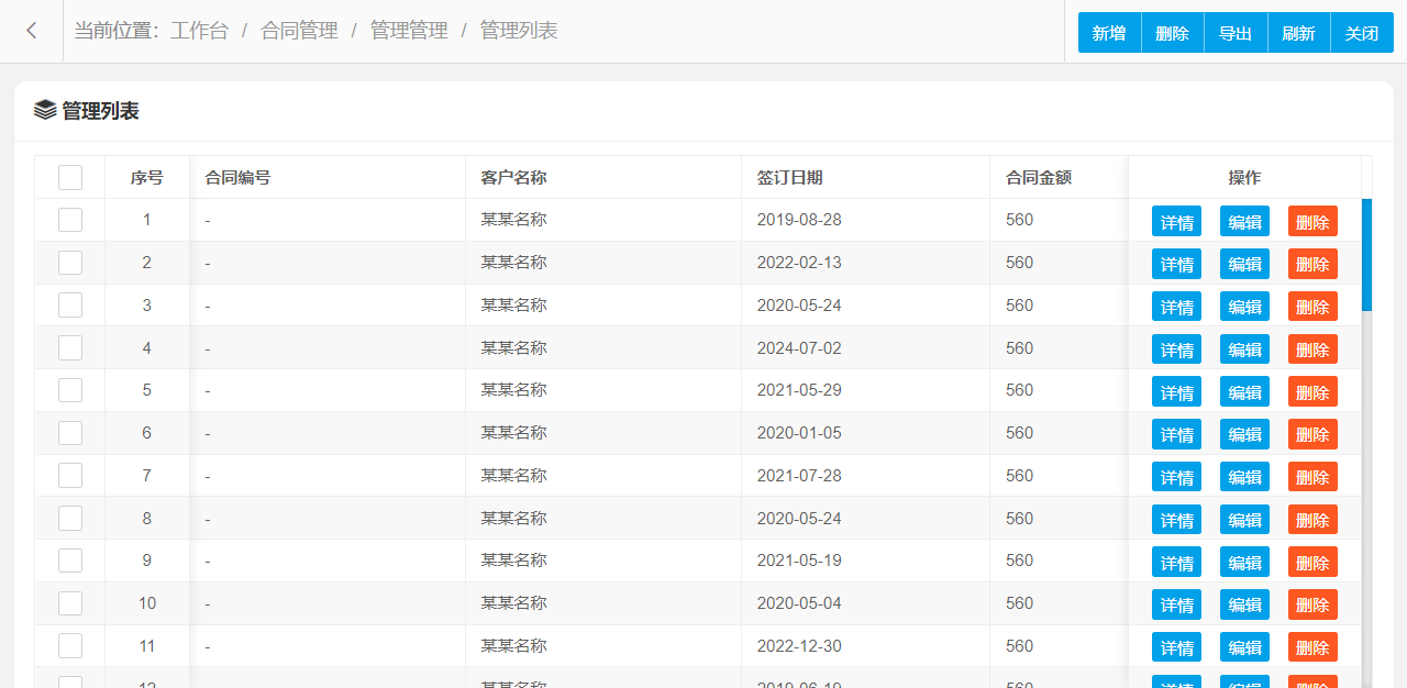 管理功能主要字段信息包含:管理编码、合同编号、客户名称、签订日期、合同金额、备注等。使用表格形式展示数据信息,方便用户查看和编辑。