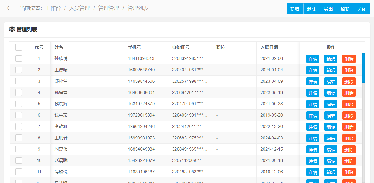 管理功能主要字段信息包含:管理编码、姓名、手机号、身份证号、职位、入职日期、备注等。使用表格形式展示数据信息,方便用户查看和编辑。