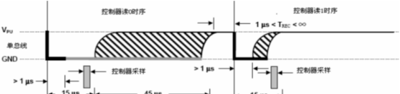 在写时序起始后15μs到60μs期间,DS18B20处于采样单总线电平状态。如果在此期间总线为高电平,则向DS18B20写入1;如果总线为低电平,则向DSl8B20写入0。