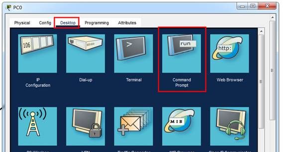 单击PC机,选中选项卡Desktop,选中Command Prompt