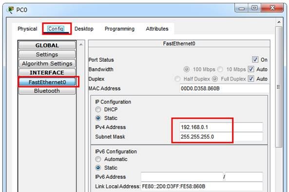 单击PC机,弹出框中选中选项卡Config,选中FastEthernet0,在IPv4地址与子网掩码处填写红框中内容