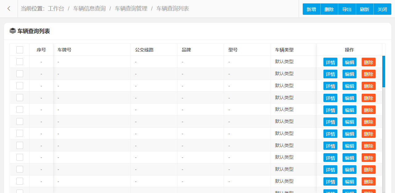 车辆查询管理设置新增、编辑、删除、条件搜索、查看详情等操作,可按照页面提示进行操作执行,界面结构设计简单,操作流程简洁明了,可提升用户操作体验。