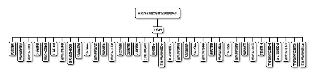工作台包含:车辆登记、车辆信息查询、出车记录查询、费用收入、费用收入查询、费用支出、费用支出查询、公交车线路设置、驾驶员登记、加油记录、加油记录查询、年审记录、年审记录查询、票据类型、票款查询、票款登记、其他员工登记、上班拿票、上班拿票查询统计、上班拿票从表、事故记录查询、售票员登记、投保记录、投保记录查询、投诉记录、投诉记录查询、维修记录、维修记录查询、违章记录、违章记录查询、下班交款、下班交款查询统计、下班交款从表、员工记录查询、月结交款查询统计、月结拿票查询统计,根据不同角色权限菜单展示会有所区别。