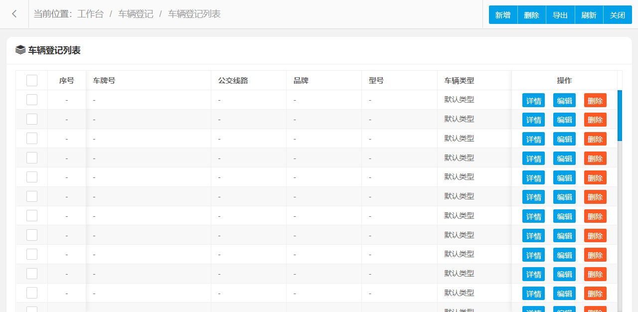 车辆登记管理设置新增、编辑、删除、条件搜索、查看详情等操作,可按照页面提示进行操作执行,界面结构设计简单,操作流程简洁明了,可提升用户操作体验。