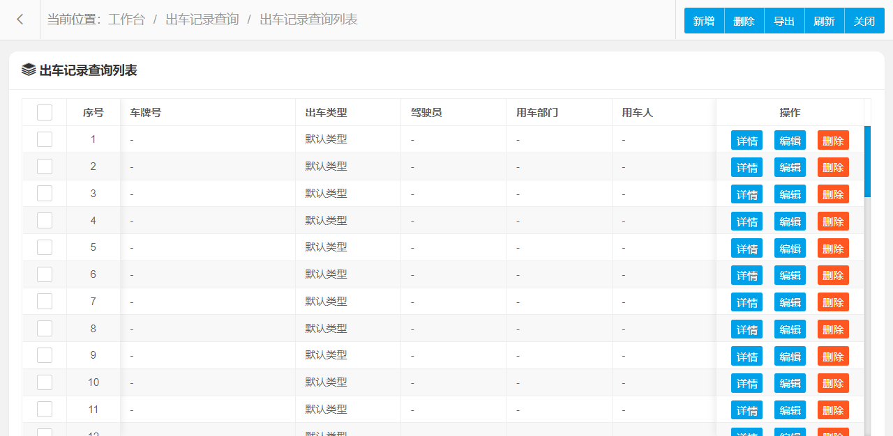 出车记录查询管理设置新增、编辑、删除、条件搜索、查看详情等操作,可按照页面提示进行操作执行,界面结构设计简单,操作流程简洁明了,可提升用户操作体验。