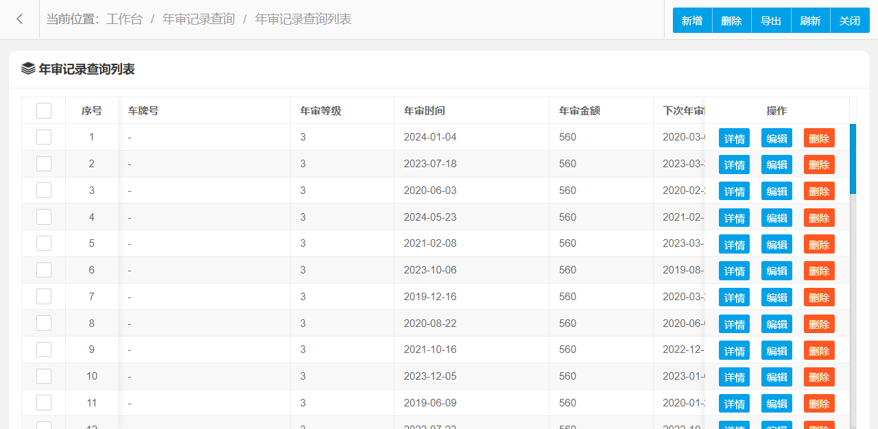 年审记录查询管理设置新增、编辑、删除、条件搜索、查看详情等操作,可按照页面提示进行操作执行,界面结构设计简单,操作流程简洁明了,可提升用户操作体验。