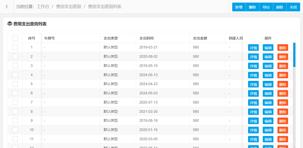 费用支出查询管理功能主要字段信息包含:编码、车牌号、支出类型、支出时间、支出金额、备注等。使用表格形式展示数据信息,方便用户查看和编辑。