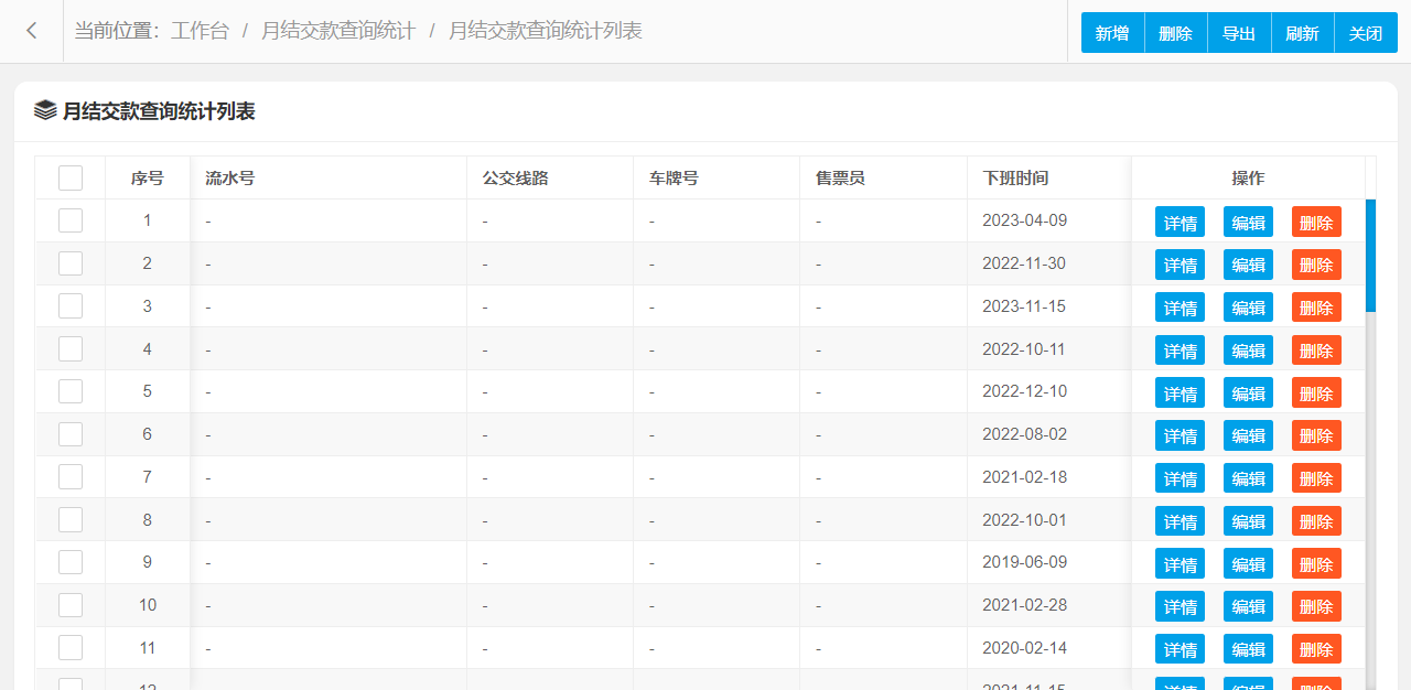 月结交款查询统计管理功能主要字段信息包含:编码、流水号、公交线路、车牌号、售票员、下班时间、车票数量张、车票金额元、备注、是否月结等。使用表格形式展示数据信息,方便用户查看和编辑。