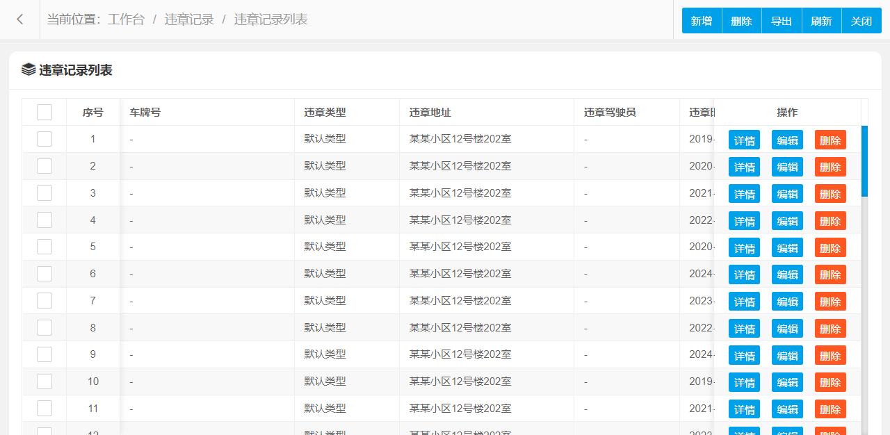 违章记录查询管理设置新增、编辑、删除、条件搜索、查看详情等操作,可按照页面提示进行操作执行,界面结构设计简单,操作流程简洁明了,可提升用户操作体验。