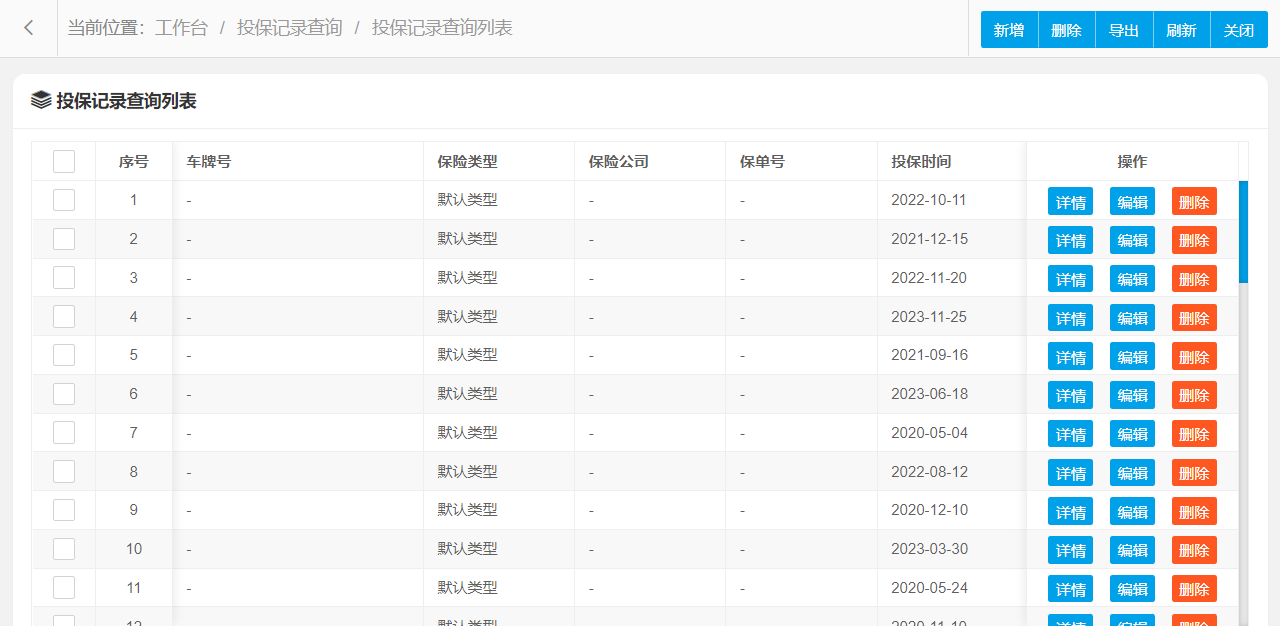 投保记录查询管理设置新增、编辑、删除、条件搜索、查看详情等操作,可按照页面提示进行操作执行,界面结构设计简单,操作流程简洁明了,可提升用户操作体验。