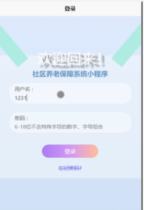 社区养老保险系统小程序登录界面,通过填写账号、密码等信息进行登录,如图5-1所示。