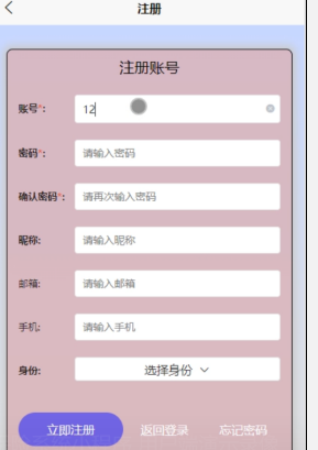 注册,通过填写账号、密码、昵称、手机、邮箱、身份等信息,输入完成后选择提交即可注册成功,如图5-2所示。