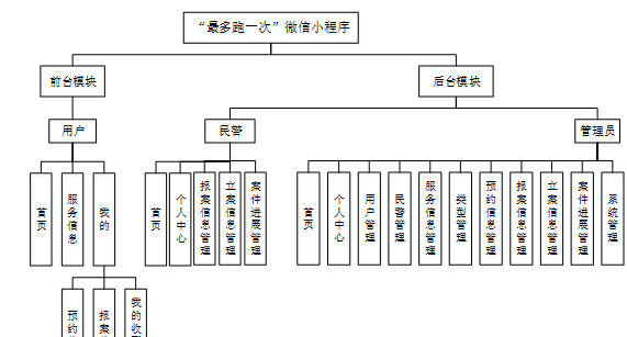 通过前面的功能分析可以将“最多跑一次”微信小程序的功能分为管理员,民警和用户三个角色,系统的主要功能包括首页、个人中心、用户管理、民警管理、服务信息管理、类型管理、预约信息管理、报案信息管理、立案信息管理、案件进展管理、系统管理等内容。任何用户只要进入网站不需登录也可浏览到的信息,后台管理是针对已登录的用户看到满意的服务信息而设计的。