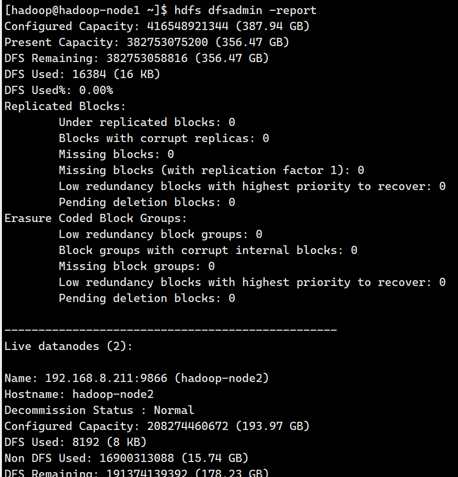 hdfs dfsadmin -report #查看集群整体状态,节点健康情况、磁盘使用等