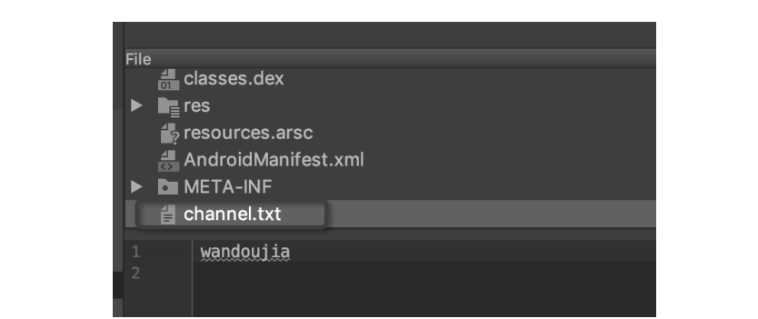 通过动态添加不同渠道的文件,应用程序对 APK 中的渠道文件读取渠道信息。通常的做法是往打完包的 APK 文件中动态添加 channel.txt 文件。