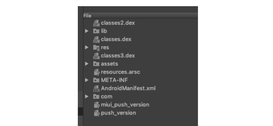 Android 应用程序安装包是一个压缩成 Zip 包的 APK 文件,我们可以通过解压缩查看 APK的组成,如图 5-1 所示。