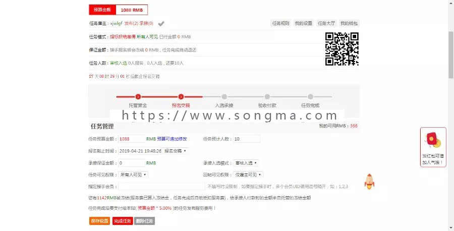 提醒:插件设置可以设置支持哪些任务模式,有的只要要投标投稿雇佣,那么设置只支持这个模式也可以,也就是说以下3个任务模式支持单选或者多选 点击查看些设置功能截图【投标投稿】(支持指定接手)1、发布任务时,冻结任务预算金额,会直接扣预算的服务费2、任务预算金额在和投稿人协商后,可以追加修改3、可以根据承接人任务完成情况,分屡次付款,付款时扣的是冻结金,扣完为止4、赔付后承接人的保证金直接给发布人,而预算金额会减少此承接人收入这部分 5、任务完成的条件是付款总金额要等于预算金额6、任务完成时退还承接人的保证金【赏金平分】(支持指定接手)1、任务预算金额在任务任务发布后不能再修改,任务人数可以根据需要再修改2、发布任务时,冻结预算金额,会直接扣预算的服务费2、每个承接人所得金额=任务金额/承接人数,在任务完成后自动平均分配的,并且退还保证金【采纳悬赏】(支持指定接手)1、悬赏人数可以根据需要再修改,只能添加不能减少2、报名人数不受悬赏人数影响,只需是可报名状态3、发布任务与修改任务时,冻结预算金额,会直接扣单价*人数的服务费4、悬赏单价直接转给承接人的同时退还承接人的保证金5、已悬赏人数必需大于0才可以完成任务,假如此人数小于任务人数,多余部分服务费不退还的,任务完成时退还未悬赏承接人的保证金提醒:以上3种任务模式都可以设置指定接手,不是指定的会员,是不能报名承接任务的,这样用于双方理解了,直接找对方做任务,不受其余会员影响!报名费功能,还可以用于活动报名功能,比方发布人要搞个活动,设置报名费1000积分,参加人报名了,积分是直接给发布人的,而任务预算金额就看成是奖励吧,少搞点没什么,实际上是完成了活动报名功能电脑版任务首页默认宽度是960,插件设置可以自己设置宽度,任务页是自适应宽度任务的一级分类就是论坛有权限的版块名称,二级分类是版块的主题分类,和论坛同步的任务通用规则:1、可以在后端设置发布任务最少需要多少积分2、支持当选功能,可以自定义手工审核当选还是自动当选3、假如设置了报名金额,会员报名后,报名金额是直接给发布人的,看实际需要设置4、假如设置了保证金,会员报名时需要交纳保证金额并且冻结,任务完成后退还5、可以根据需要,设置任务内容可见权限与回帖可见权限6、没当选可以自己取消报名,已当选了承接人可以主动赔付退出,管理员可以强制给某承接人赔付退出