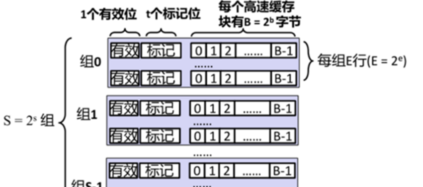 高速缓存的结构将m个地址位划分成了t个标记位,s个组索引位和b个块偏移位: